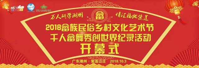 10月3日,由由广东省旅游局主办,潮州市旅游局、湘桥区人民政府协办,北京家有童星游学联盟、潮州紫莲生态旅游度假区承办的2018家有童星游学欢乐汇“畲族民俗乡村文化艺术节——千人畲舞秀”创世界纪录活动在广东潮州紫莲生态旅游度假区盛大开幕!万众瞩目的“千人畲舞秀”创世界纪录表演精彩呈现。